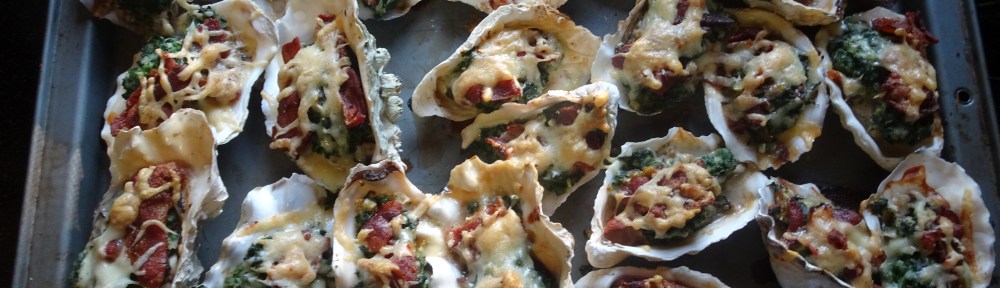 Mix up creamed spinach, onions, garlic, bread crumbs and some Tabasco or hot sauce. Spread mixture over oysters.