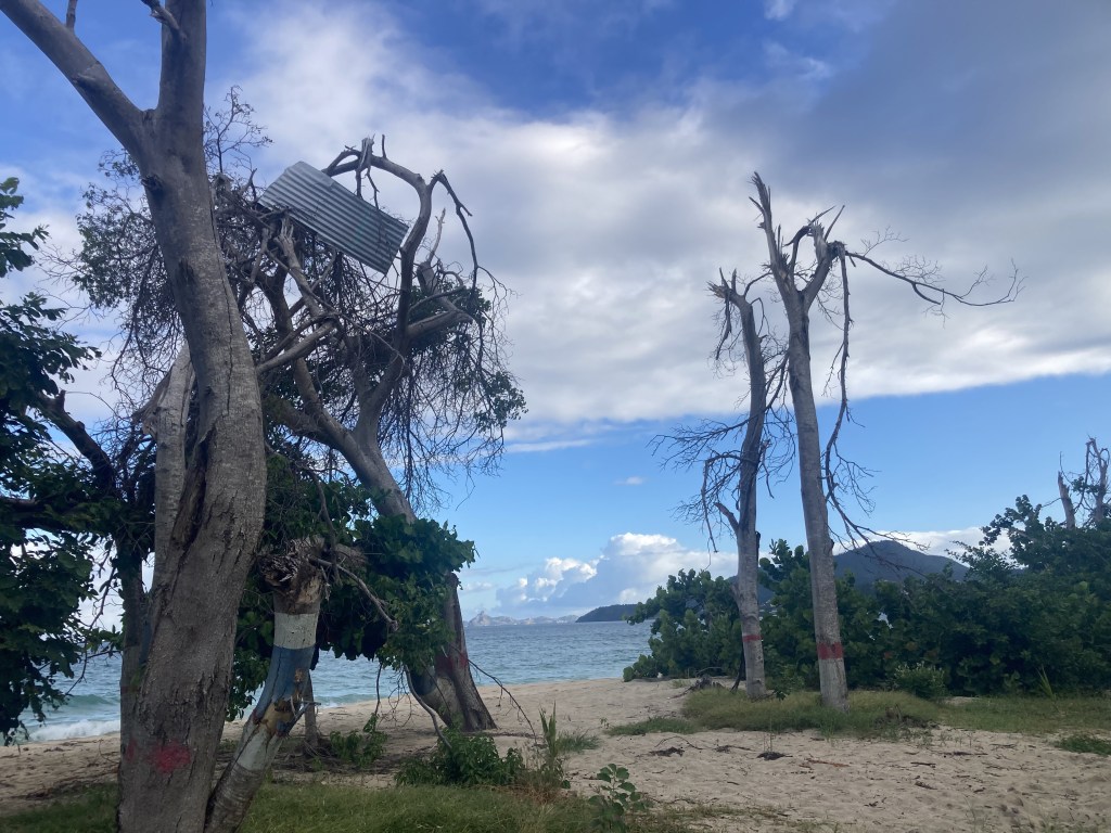 The lush and green vegetation is once again covering the island which was pruned and denuded of any foliage but has come back with a vengeance., except for the mangroves which are grey and will take a while to rebound. Many dead tree skeletons stick out from the verdant greenery, some of them with pieces of corrugated, galvanized roofing stuck up in the dead branches. Heaps of rubble and debris dot the landscape and mountains, the size of a four storied apartment buildings of mangled roofing tin, appliances and lumber, mostly sorted and piled up in the central sports field and on government land, eventually to be shipped to Trinidad or to be used for landfill, I guess.