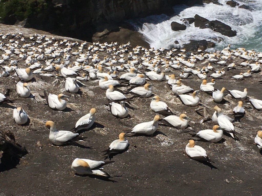 From Dargaville we made a detour to the Gannet colony in Muriwai Beach where thousands of these singular birds roost and nest on the exposed cliffs. You can walk right up to them and they completely ignore the gawking tourists. They are a mix between a seagull and an albatross and can spend years away in Oz (Australia) before returning here to nest. They mate for life and it amazed me how these birds find each other’s mate amongst the thousands sitting on their nests right next to each other. To me they all looked the same. A fascinating display of nature at its best.